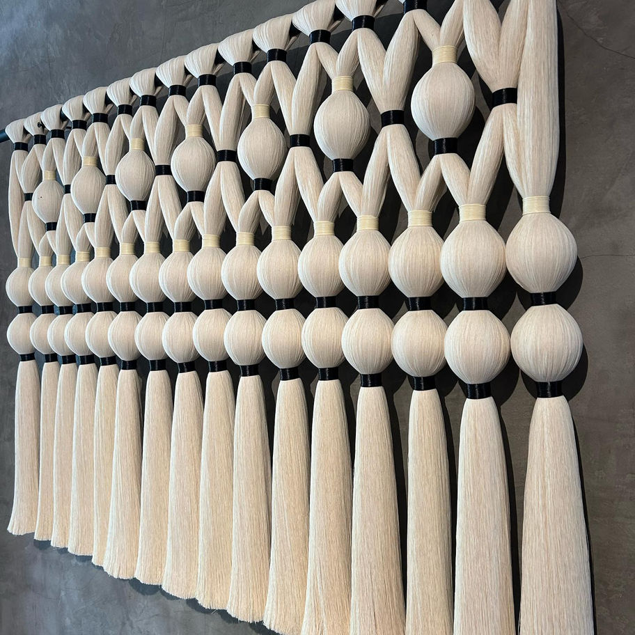 Esta pieza única está montada sobre una barra de metal y confeccionada con algodón gofrado e hilo encerado, creando una textura y profundidad cautivadoras.