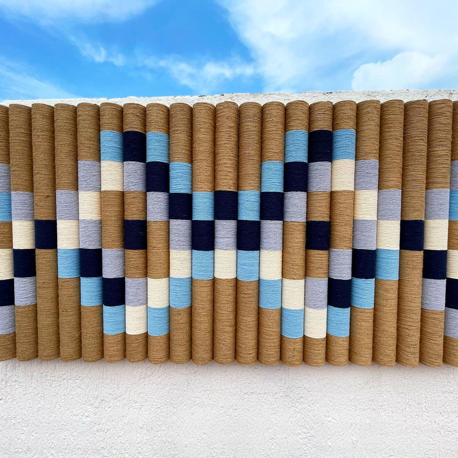 Esta pieza presenta 23 formas cilíndricas, montadas sobre un marco de madera envuelto en yute, hilo de algodón y cordel, creando una textura visualmente impactante. Con unas medidas de 2 metros por 90 centímetros, este mural es la pieza perfecta para añadir profundidad y carácter a cualquier pared.